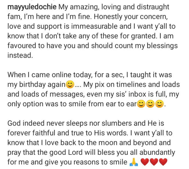 “My amazing, loving and distraught fam, I’m here and I’m fine. Honestly your concern, love and support is immeasurable and I want y’all to know that I don’t take any of these for granted. I am favoured to have you and should count my blessings instead.