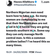 “Northern Nigerian men need to learn how to have sex. So many women are complaining to me that their Northern men are not good in bed, hence they are turning to Southern men. Some say they can only manage North Central men. Is this a common problem?” she wrote.
