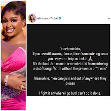 Nollywood actress Etinosa has called on feminists to join her in speaking out against the alleged ill-treatment of women who visit clubs, bars, hotels, and other recreational spots without male companions.