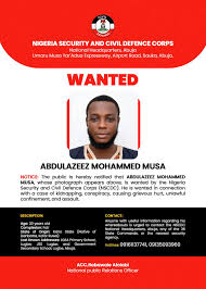 “The Nigeria Security and Civil Defence Corps has declared one Abdulazeez Mohammed Musa wanted in connection with alleged cases of kidnapping, conspiracy, causing grievous harm, unlawful confinement, and assault,” the statement read.